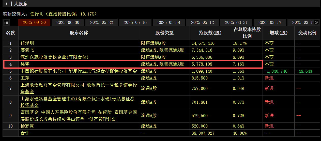 小财注:截至三季度末,吴攀位列思泉新材第四大股东,持股比例7.16%,现任公司董事、副总裁。二级市场方面,思泉新材股价自2025年4月低点迄今累计最大涨幅811%。