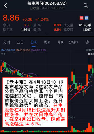 受美国爆发禽流感消息与鸡苗价格上涨刺激,养鸡概念股在4月18日全天大涨。而《盘中宝》文中梳理提及的益生股份,其在4月18日快速拉升并封住涨停,并在次日冲高回落,截至4月22日收盘,区间最高涨幅达14.51%。