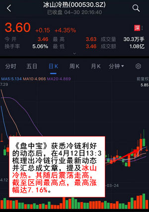 《盘中宝》获悉此动态后,在4月12日13:30梳理出冷链行业最新动态并汇总成文章,提及冰山冷热。公司联营公司松下冷链与京东自营、盒马鲜生、美团优选等电商均有业务合作,其随后2日持续上涨,截至4月13日区间最高点,最高涨幅达7.16%。