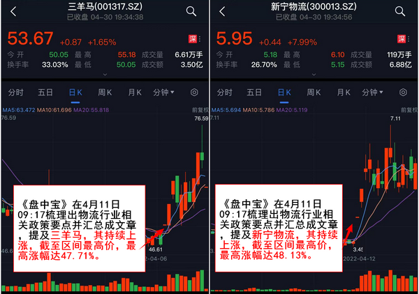 文中提及三羊马与新宁物流。其中,三羊马的股票持续上涨,截至4月22日区间最高价,最高涨幅达47.71%。此外,新宁物流也在持续上涨,截至4月21日区间最高价,最高涨幅达48.13%。