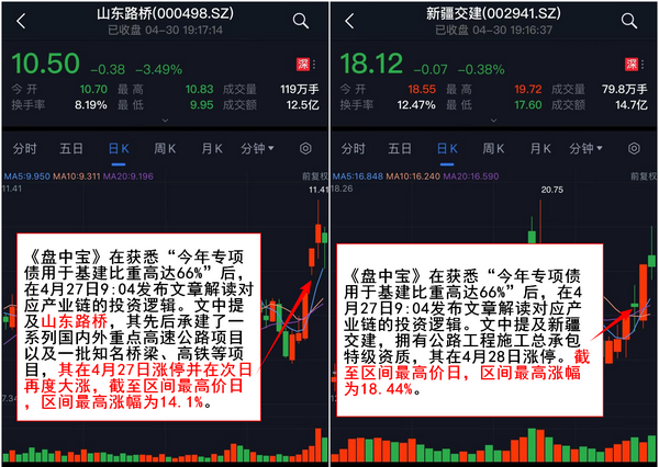 财联社王牌VIP之一的《盘中宝》在获悉“今年专项债用于基建比重高达66%”后,在4月27日9:04发布文章解读对应产业链的投资逻辑,栏目引用券商观点指出“重磅会议强调了当前基础设施建设在畅通国内大循环、促进国内国际双循环的重大意义,未来几个季度固定资产投资中基建投资增速依旧会维持较快的增速。”
