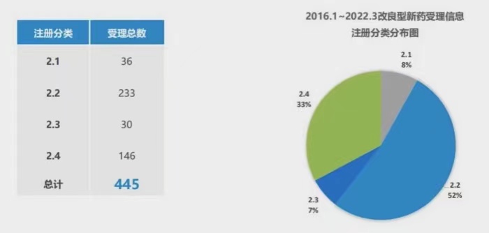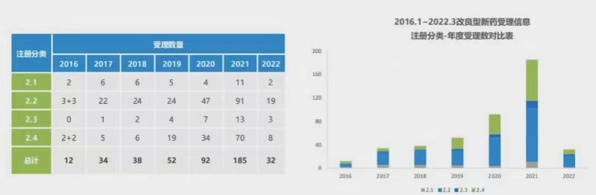 数据显示,自2016年1月至2022年3月的近5年时间里,化药2类改良型新药的注册受理呈现递增趋势,其中2021年显著增加,为2020年总量的2倍。