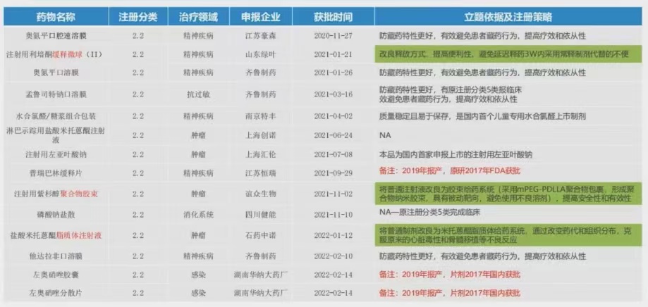 再具体看到2.2类获批品种的明细,从获批的剂型上看,除了4个口溶膜,比较有特点的还有:绿叶制药的利培酮缓释微球,该药物改良了释放方式,并且通过一期临床试验豁免了二期和三期临床。