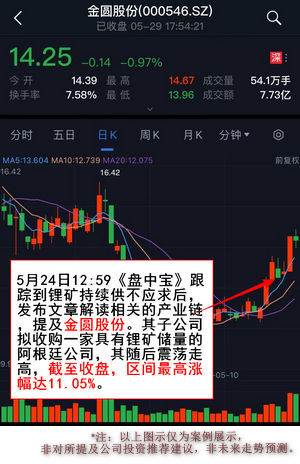 上市公司中,金圆股份子公司拟收购一家具有锂矿储量的阿根廷公司,其随后震荡走高,截至5月29日收盘,区间最高涨幅达11.05%。
