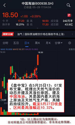 上市公司中,中国海油是国内最大的海上原油及天然气生产商,其随后持续拉升,截至5月27日收盘,区间最高涨幅达10.32%。