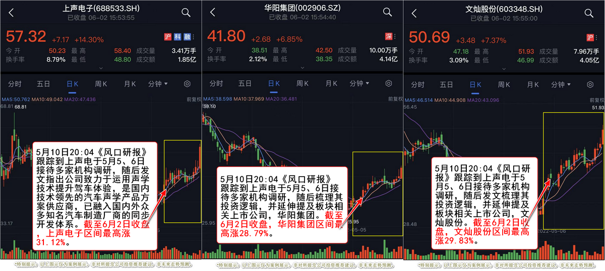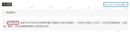 5月10日20:04《风口研报》跟踪到上声电于5月5、6日接待多家机构调研,随后发文指出公司致力于运用声学技术提升驾车体验,是国内技术领先的汽车声学产品方案供应商,已融入国内外众多知名汽车制造厂商的同步开发体系。此外,栏目还延伸提及板块相关上市公司,华阳集团、文灿股份。