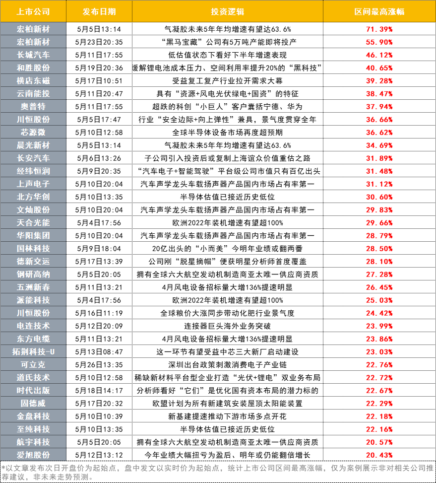 5月1日-5月31日,《风口研报》梳理的优质研报涉及上市公司区间具体表现如何?