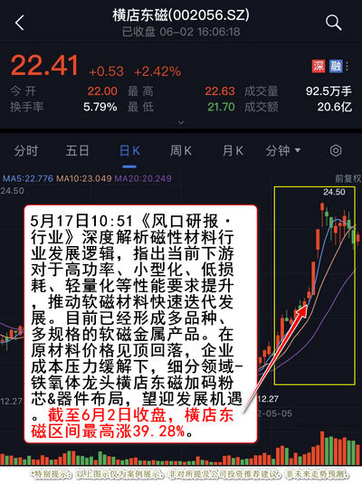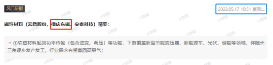 5月17日10:51《风口研报·行业》深度解析磁性材料行业发展逻辑,指出当前下游对于高功率、小型化、低损耗、轻量化等性能要求提升,推动软磁材料快速迭代发展。目前已经形成多品种、多规格的软磁金属产品。在原材料价格见顶回落,企业成本压力缓解下,细分领域-铁氧体龙头横店东磁加码粉芯&器件布局,望迎发展机遇。