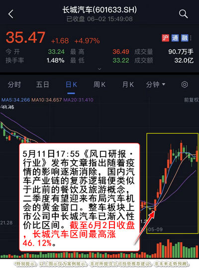 整车领域,除长安汽车,栏目还曾覆盖长城汽车,5月11日17:55《风口研报·行业》发布文章指出随着疫情的影响逐渐消除,国内汽车产业链的复苏逻辑便类似于此前的餐饮及旅游概念,二季度有望迎来布局汽车机会的黄金窗口。整车板块上市公司中长城汽车已渐入性价比区间。