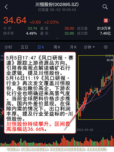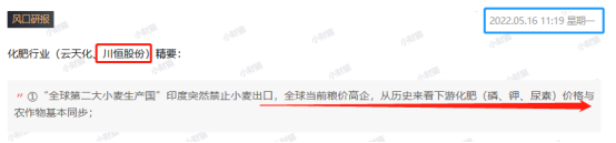 5月16日11:19《风口研报·行业》再次发文覆盖川恒股份,本次梳理以粮食问题引起化肥价格上涨的外部诱因为切入点,指出粮价高企,下游农化行业也明确迎来高景气度。当前全球肥料价格步步推高,国内外差价显现,在保障内需的情况下,出口利润丰厚,提及行业受益标的-川恒股份。