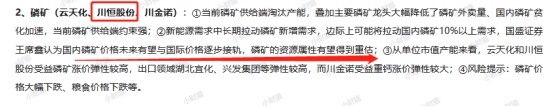 5月5日17:47《风口研报·赛道》跟踪上游资源品方向,引用券商观点解读磷矿石行业逻辑,指出当前磷矿石不可再生属性强,而下游磷酸铁锂预计拉动1000~1250万吨矿需求,边际上贡献10%以上增量需求。当前磷化工企业赚的钱来自于:自有磷矿,磷肥出口,磷酸盐等,具备资源属性的上市公司有望受益,提及川恒股份。