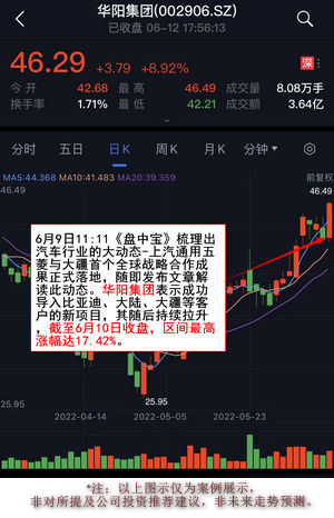 6月9日11:11《盘中宝》梳理出汽车行业的新动态-全球首款搭载大疆车载系统的新能源量产车型即将上市。栏目随即发文《“国民神车”又搞大事情,牵手大疆加码智能驾驶》解读此动态,梳理出产业链上多家公司。