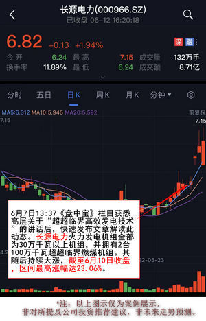 6月7日13:37《盘中宝》栏目获悉高层关于“超超临界高效发电技术”的讲话后,快速梳理出其讲话要点并汇总发布文章《超超临界高效发电技术已在全国推广》,文中引用业内人士观点解读相关产业链。