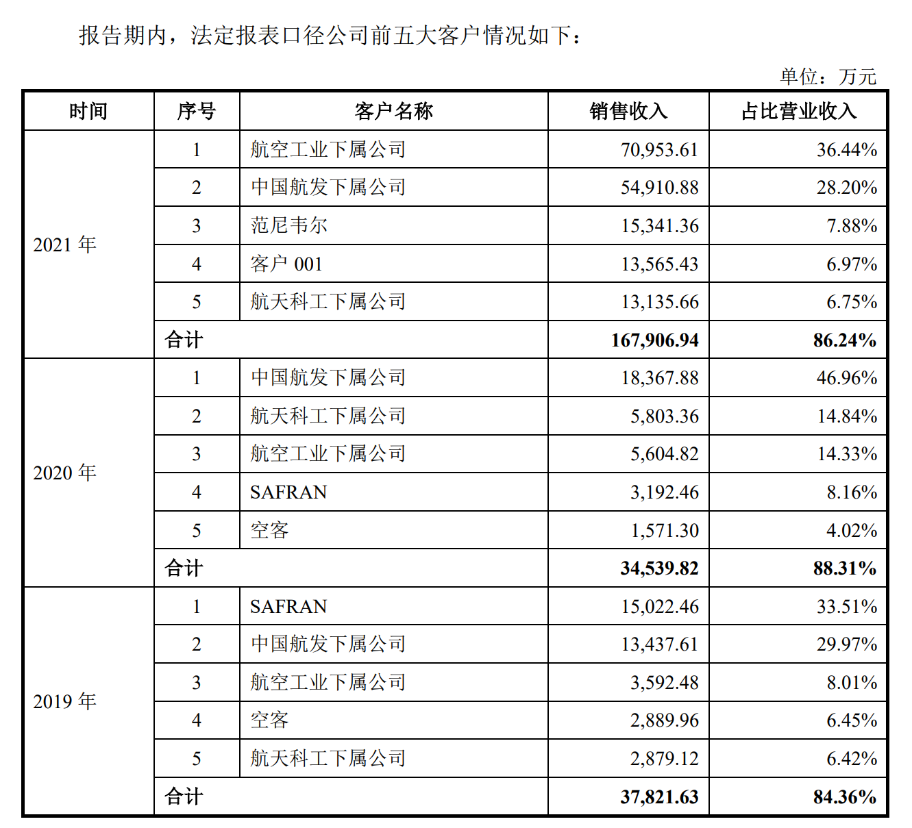 报告期内,前五大客户占当期营业收入比例为 84.36%、88.31%和 86.24%。航材股份方面表示,客户集中度较高的主要原因是我国航空航天产业布局及配套供应关系特征所致。另外,中国航发集团下属公司与航材股份同受中国航发集团控制,双方存在关联关系,2021年前者为航材股份第二大客户,销售规模超过5亿元。