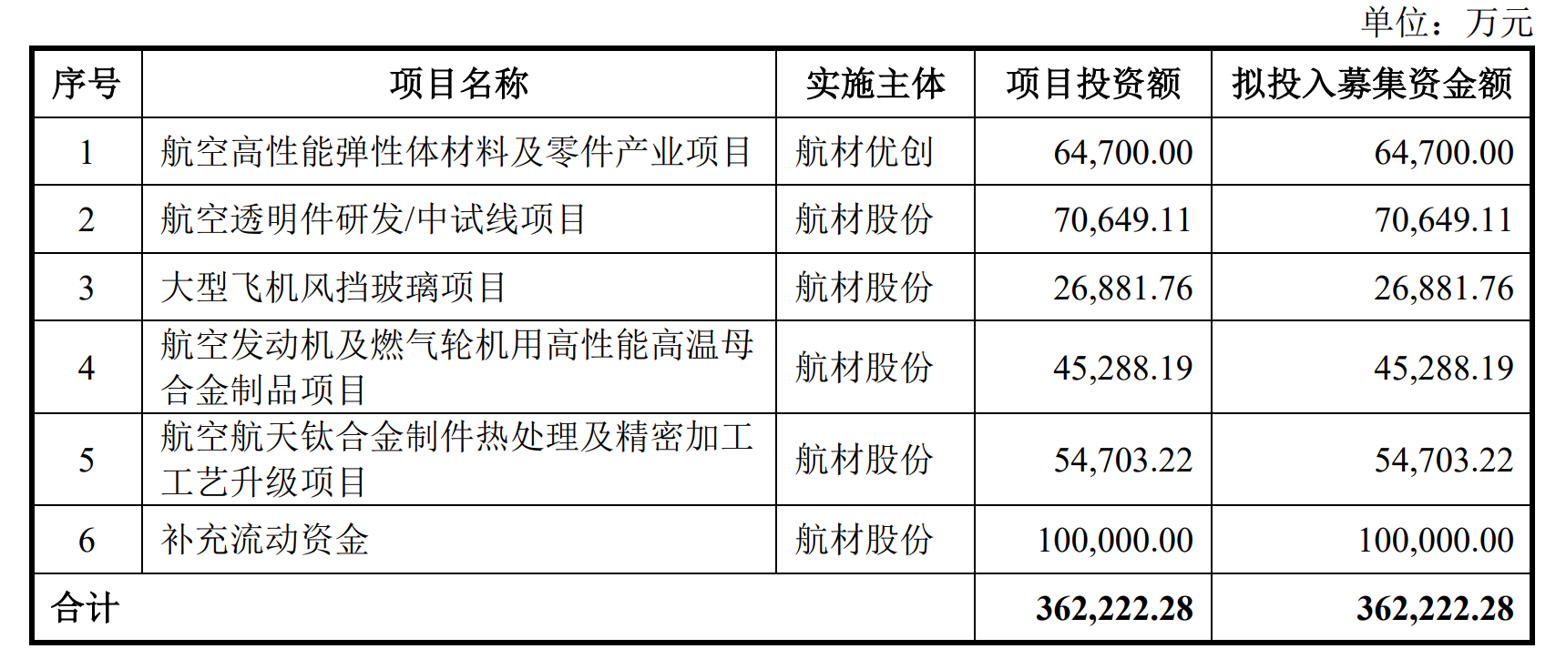招股书显示,航材股份本次于科创板公开发行股票的数量不超过6350万股,占发行后总股本的比例不低于25%;拟募资规模为36.22亿元,将用于航空高性能弹性体材料及零件产业项目、大型飞机风挡玻璃项目等共计5大项目的建设,此外将投入10亿元用以补流。