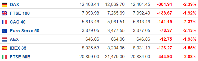 随着欧元汇率跌至近二十年新低,正在交易的欧洲市场也一同走弱,多个股指跌幅接近2%。