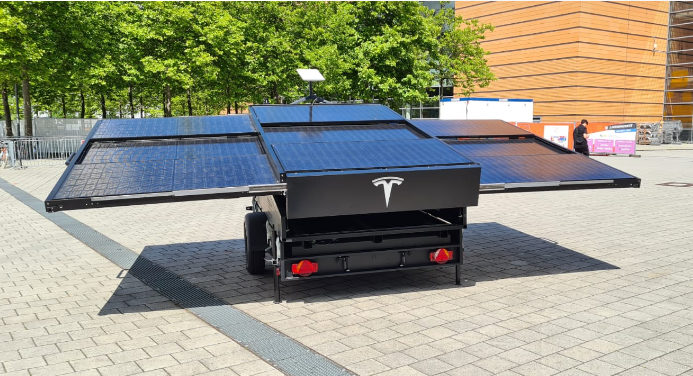 在本周一德国汉诺威Ideen展会上,特斯拉首次展示一款太阳能增程拖车。从外形来看,这是一款装备太阳能帆板的拖车,可以在停车状态下展开并进行充电。特斯拉官方并没有透露这辆车的参数,但从现场图片来看,这辆拖车上还配备了星链网络的接受器。