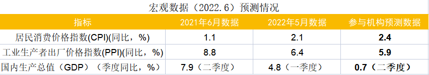 参与预测机构对于居民消费价格指数(CPI)的同比涨跌幅预测最高值2.5%,最低2.3%,中值2.4%。对工业生产者出厂价格指数(PPI)的同比涨跌幅预测最高值6.2%,最低值5.5%,中值为5.9%。对二季度国内生产总值(GDP)同比涨跌幅预测最高值1.2%,最低值-0.2%,中值为0.7%。