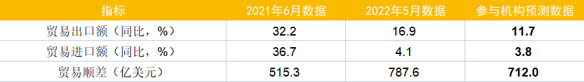 参与预测机构对于贸易出口额同比增速的预测最高值为15%,最低值为7%,中值11.7%;对贸易进口额同比增速的预测最高值9.6%,最低值-0.6%,中值为3.8%;对于贸易顺差的预测最高值为796亿美元,最低为650亿美元,中值为712亿美元。