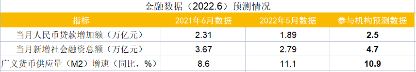 调查显示,参与预测机构对于6月人民币新增贷款的预测最高值2.7万亿,最低值2.3万亿,中值2.5万亿。对社会融资规模增量的预测最高值5.6万亿元,最低值3.6万亿元,中值4.7万亿元。对M2增速预测最高值11.2%,最低值10.6%,中值为10.9%。