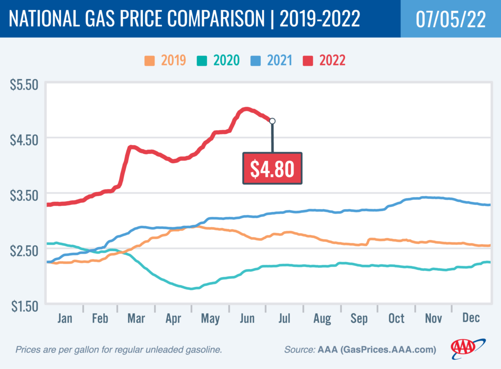 根据美国汽车协会(AAA)的最新报价,目前全美平均油价为每加仑4.779美元,较近期高点略有回降,但去年同期仅每加仑3.134美元,同比增幅超过了50%。