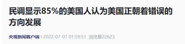 根据美联社联合NORC公共事务研究中心当地时间6月29日发布的民意调查,85%的美国成年人认为美国正朝着错误的方向发展,只有14%的人认为美国朝着正确的方向发展。