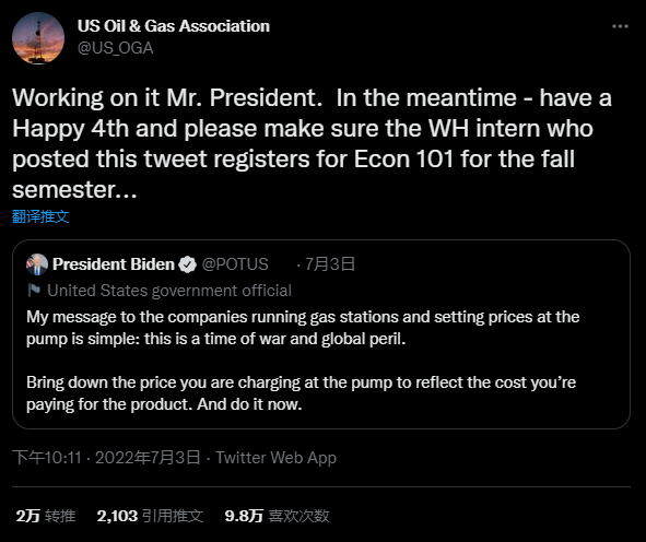 而美国石油和天然气协会(USOGA)就比较不给拜登面子,该协会引用转发了拜登的推文并表示,