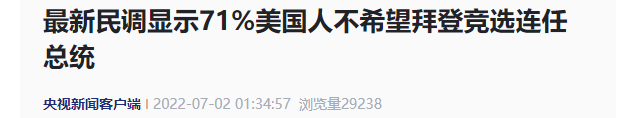 另外,哈佛大学CAPS-Harris 7月1日发布的民意调查显示,71%的受访者认为拜登不应该参加第二个总统任期的竞选。