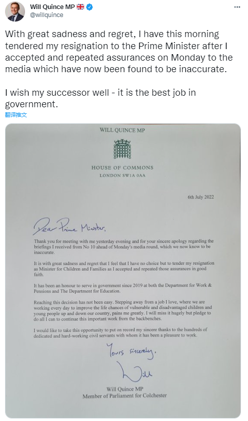 财联社7月6日讯(编辑 史正丞),从当地时间周二晚间开始,随着英国财政大臣苏纳克和卫生大臣贾维德双双辞职,又一场围绕着约翰逊政府的风暴开始呼啸。根据最新的消息,就在一个小时前英国儿童和家庭事务部长威尔·昆斯也宣布递交辞呈。