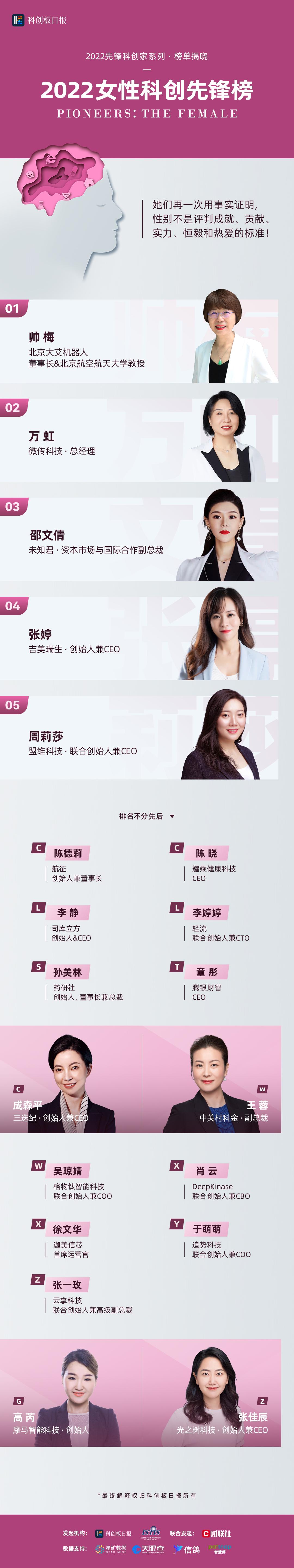 针对女性科创先锋榜单,这一榜单的推出初心,一方面是为了更好挖掘女性角色在科创事业中所作的贡献,另一方面,也希望能客观呈现当代女性创业的商业环境,以及女性科创先锋的真实心声。此次上榜的20位优秀女性科创家中,有12位为创始人/联合创始人,55%的教育背景为硕士。相较于科学家或科创精英,女性科创精英的上榜人学术表现较为普通,但从过往工作履历来看,有12位曾经有过世界500强工作经历,其中4位曾有D-level任职经历。此次上榜人所在企业的融资轮次,35%为A轮。其中,以帅梅领导的北京大艾机器人、吴琼婧领导的格物钛智能科技、李婷婷领导的轻流等企业,在资本市场表现亮眼。