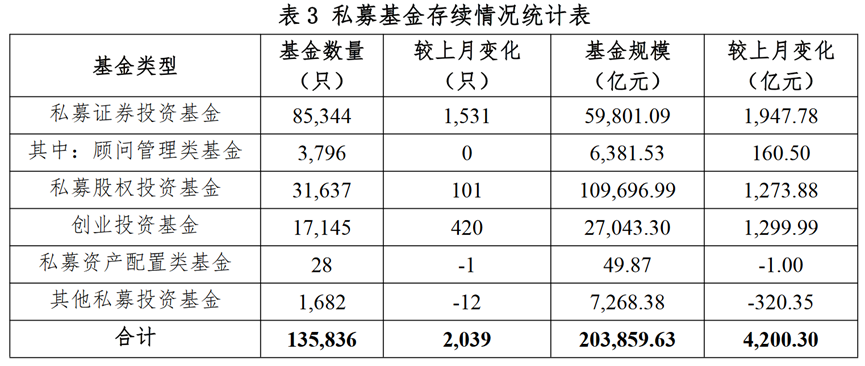 其中,存续私募证券投资基金8.53万只,存续规模5.98万亿元,环比增长3.37%;存续私募股权投资基金3.16万只,存续规模10.97万亿元,环比增长1.17%;存续创业投资基金1.71万只,存续规模2.70万亿元,环比增长5.05%。