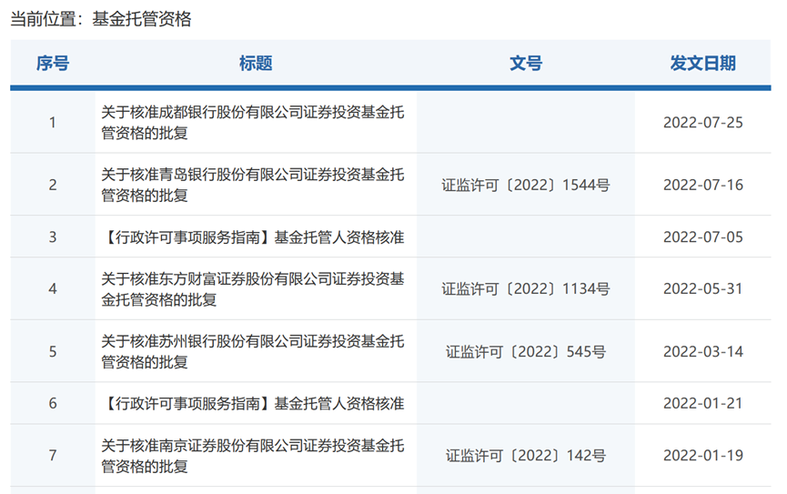 另据证监会网站披露,今年内南京证券、东方财富证券等2家券商,以及苏州银行、青岛银行、成都银行等3家银行已经证监会陆续获获批相应资格。近年来,监管层发放该业务资格的速度明显加快。