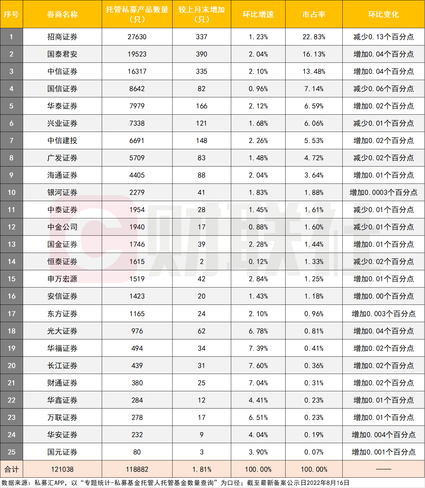 私募汇APP显示,截至最新备案公示日8月16日,招商证券私募产品托管数已达2.76万只,市占率22.83%,但仍然保持遥遥领先的领跑姿势;国泰君安私募产品托管数1.95万只,市占率16.09%;中信证券私募产品托管数1.63万只,市占率13.48%。