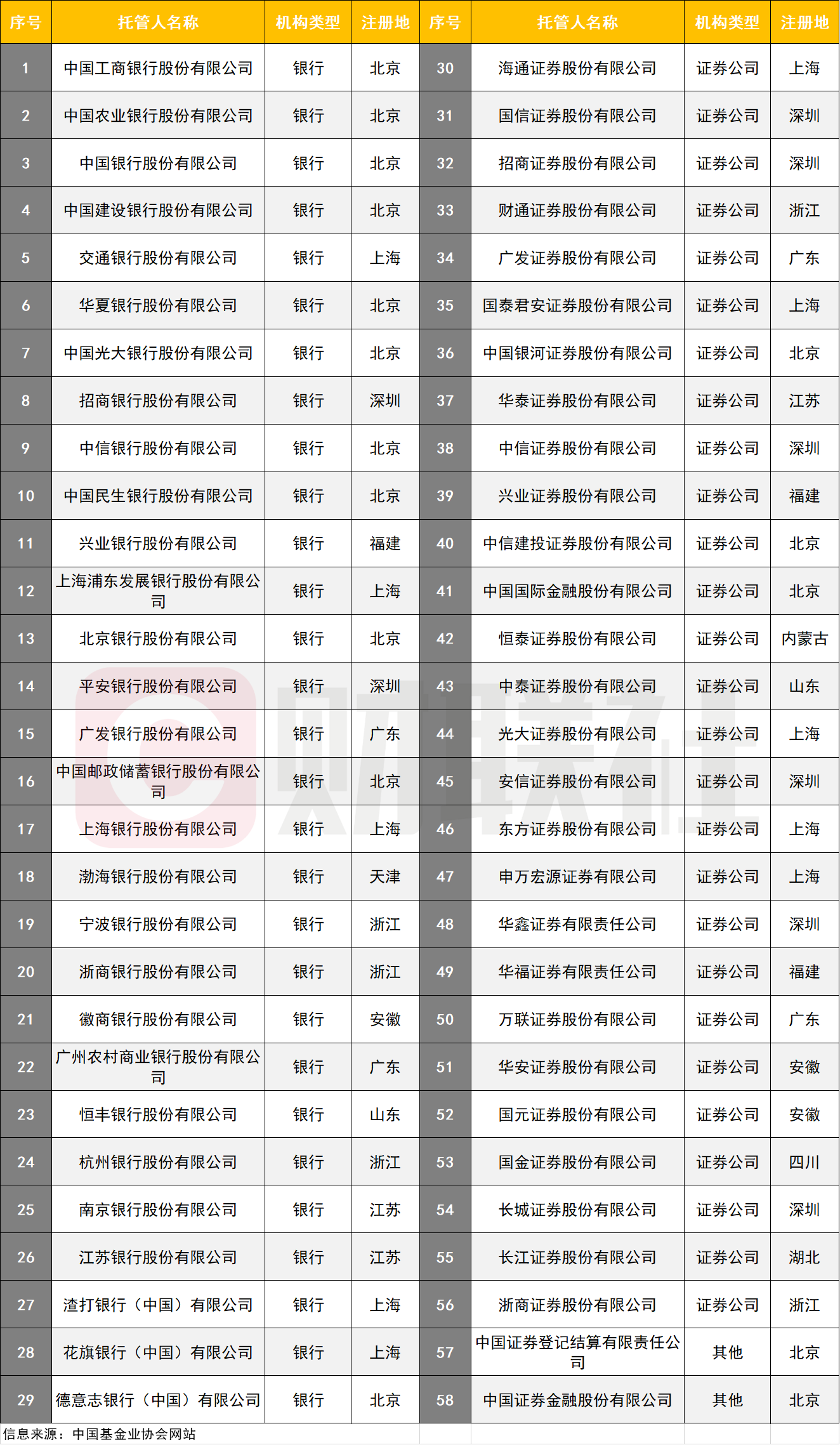 基金托管等业务资格的申领正成为券商争先抢滩的热门牌照之一,也吸引不少中小券商入围。中基协网站公示,截至目前共有58家机构获得基金托管资格,除中国结算、证金公司外,还包括27家券商、29家银行。