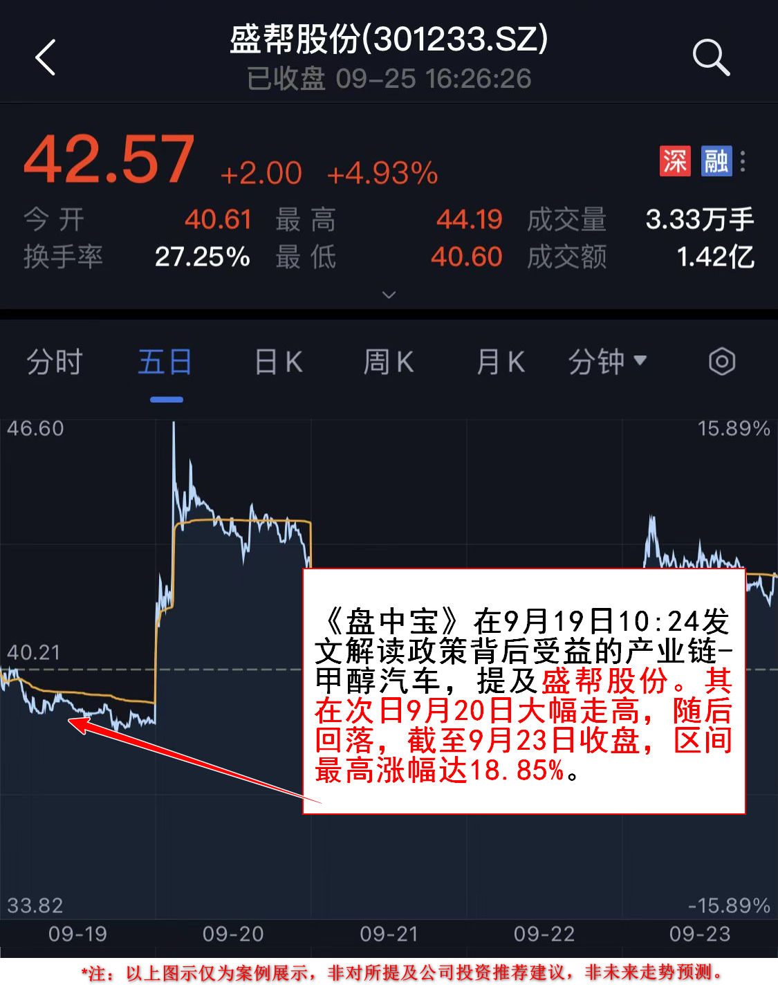 文中梳理出多家甲醇汽车供应链上优质公司,其中盛帮股份开发出应用于新能源汽车的高速油封、甲醇汽车密封件等产品,目前正在推广中,部分产品已实现销售。其在次日9月20日大幅走高,随后回落,截至9月23日收盘,区间最高涨幅达18.85%。