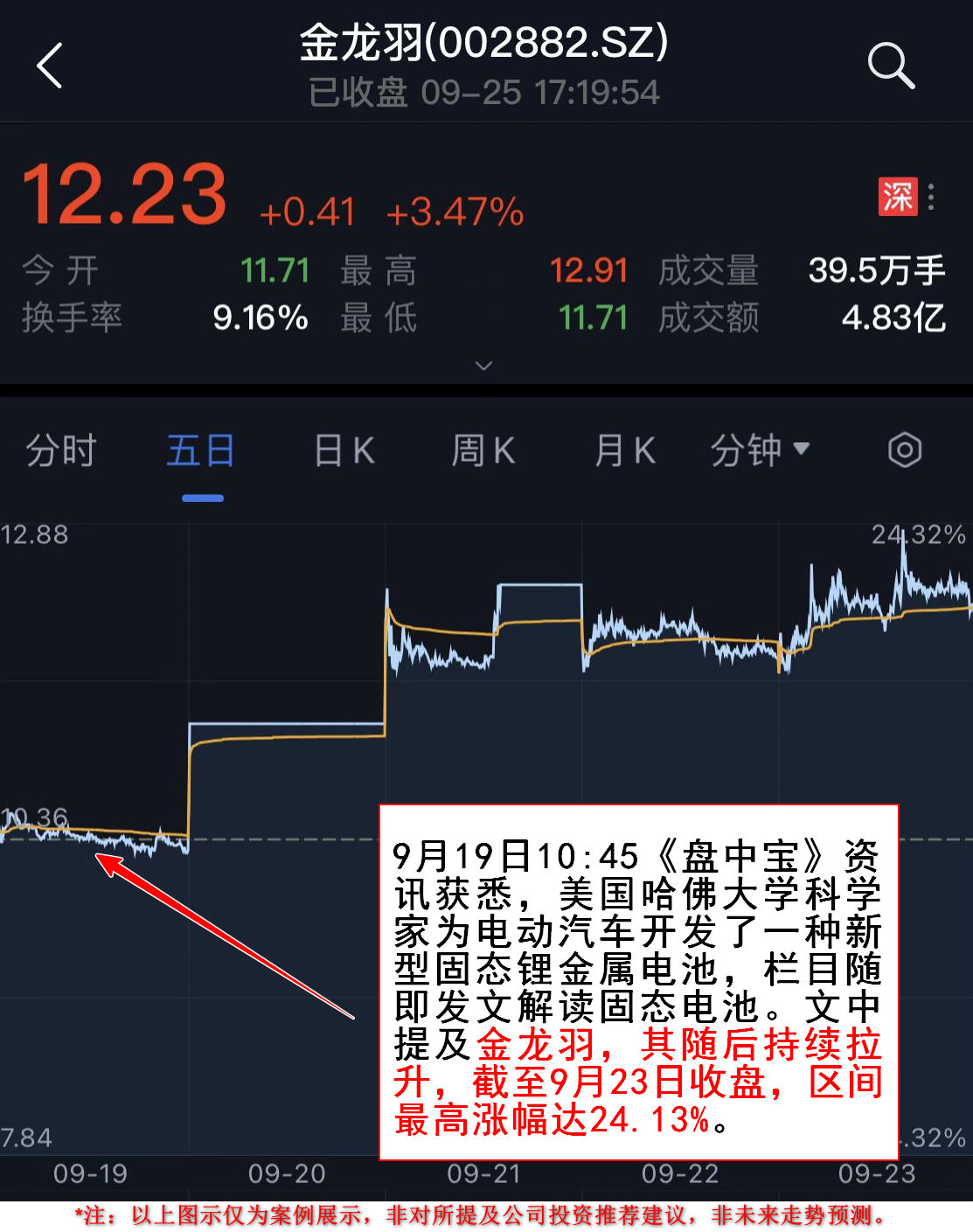 上市公司中,金龙羽固态电解质中试研发平台进入试生产阶段,硅碳负极材料小试研发平台进入样品研制阶段。其随后持续拉升,截至9月23日收盘,区间最高涨幅达24.13%。