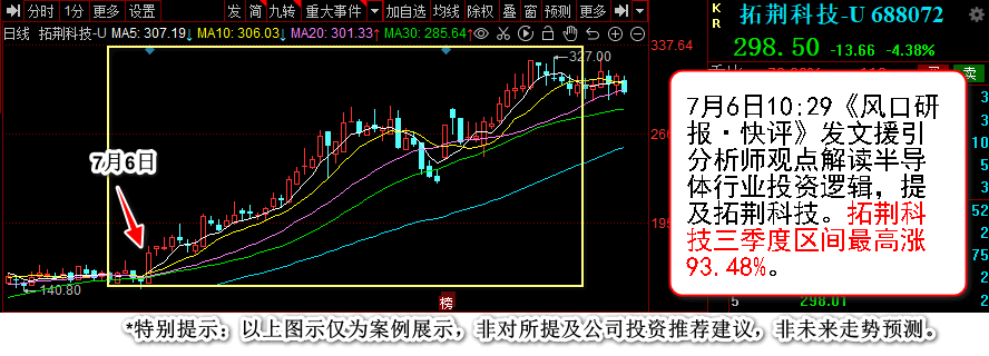 7月6日10:29《风口研报·快评》随即发文援引分析师观点解读半导体行业,指出国内半导体产业链未受影响,三季度更将迎订单高峰期,大陆长存二期、长鑫二期等诸多晶圆厂需求增加,中芯京城项目近期或取得进一步突破,拉动本土设备需求。