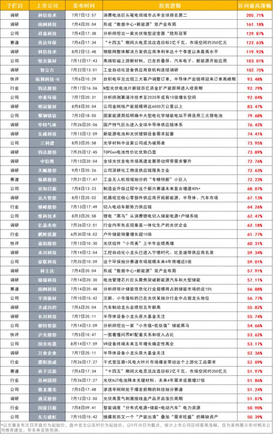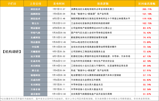 作为《风口研报》重要子栏目之一,【机构调研】总能在海量机构调研中挖掘出最具投资价值的线索,并在此基础上举一反三,纵深梳理产业链。三季度,【机构调研】无间断追踪机构调研踪迹,梳理出诸多优质标的,其中覆盖智立方区间最高涨幅超102%、延伸挖掘南网科技区间最高涨幅超161%、单月2次提及科信技术区间最高涨幅翻2倍: