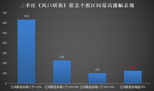 以文章发布时上市公司股价为起始价(非交易时间发布的文章则采用发布后首个开盘价计算起始价),以9月30日为截点,统计栏目覆盖上市公司「区间最高涨幅」。三季度,《风口研报》梳理上市公司区间最高涨幅超过10%的次数合计458次,占比41.94%。其中区间最高涨幅超30%个股数量高达126只,区间最高涨幅翻倍个股数量达7只。