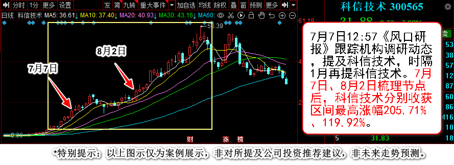 在7月7日与8月2日两个梳理节点后,科信技术分别收获区间最高涨幅205.71%、119.92%,居于三季度区间最高涨幅榜首。