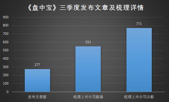 《盘中宝》在三季度期间共发布文章277篇,其中独家资讯5篇,栏目回顾文章12篇,以65个交易日来算,日均精选4-5篇价值资讯。期间共涉及梳理551家上市公司(沪深市场513家,科创板38家),其中152家公司被栏目结合不同 “驱动因素”梳理提及2次及以上。