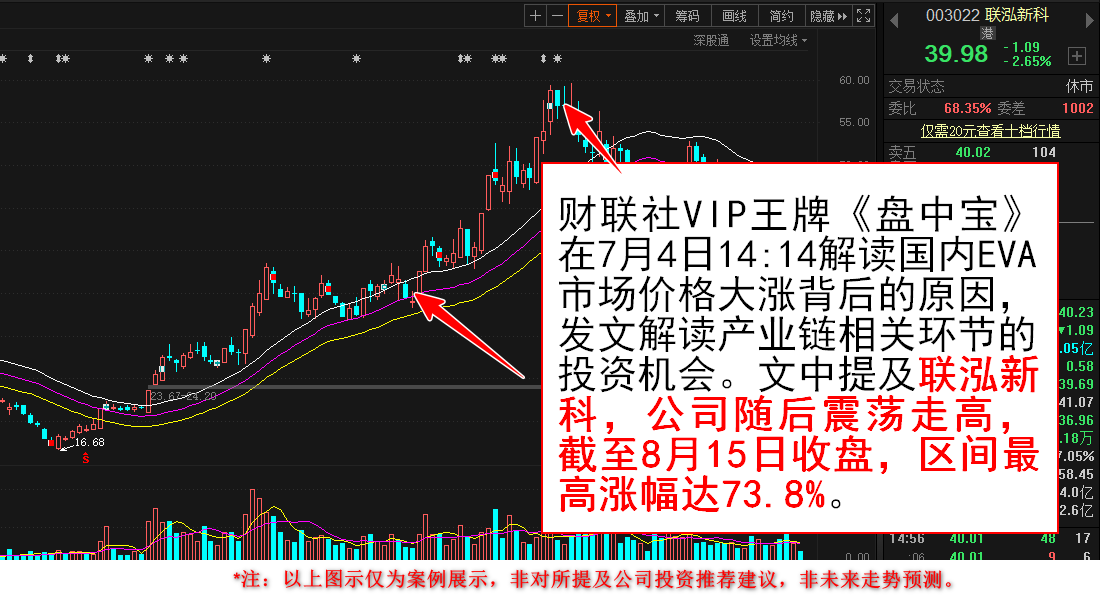 文中提及联泓新科,其EVA产品2021年全年产量13.04万吨,产能利用率为107.80%,公司表示EVA价格随行就市,目前订单饱满,产品全产全销。此外,联泓新科还有10万吨/年碳酸酯联合装置可生产碳酸乙烯酯(EC)、碳酸二甲酯(DMC)、碳酸甲乙酯(EMC)、碳酸二乙酯(DEC)等主要电解液溶剂材料。公司随后震荡走高,截至8月15日收盘,区间最高涨幅达73.8%。