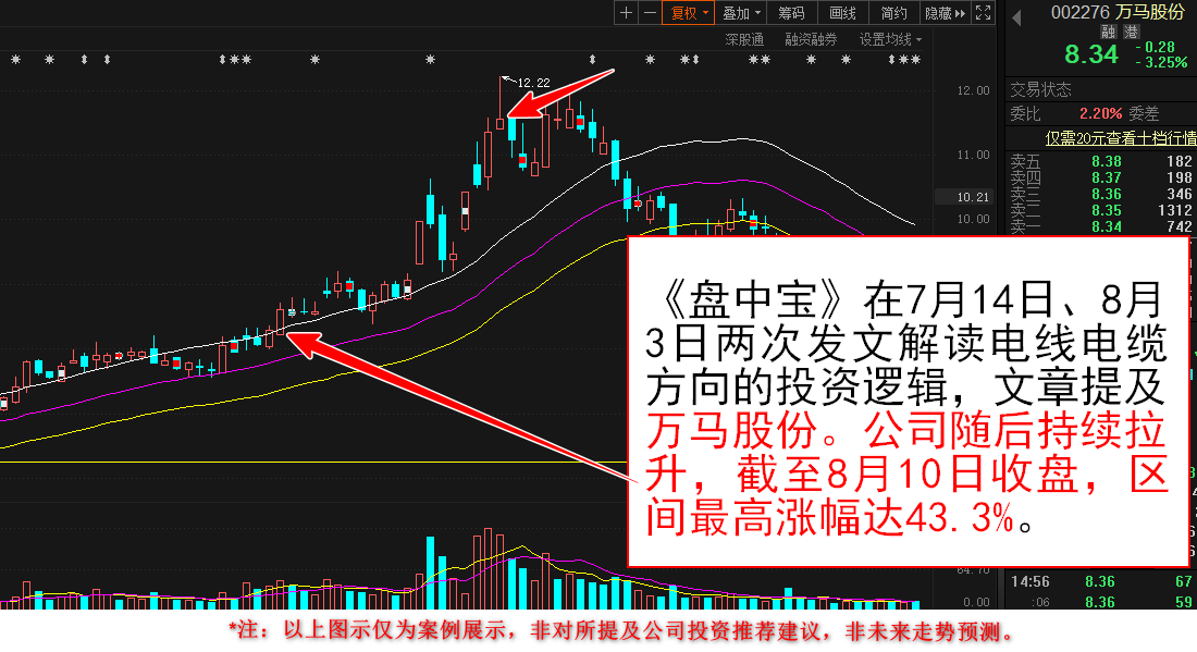 两篇文章均提及电线电缆相关产业链的投资机会,提及万马股份。公司具备完善的从线缆材料到各品类电线电缆、 通信线缆、 新能源线缆的完整产业链,其随后持续拉升,截至8月10日收盘,区间最高涨幅达43.3%。