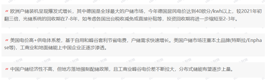 储能各细分方向中,户用储能的景气度持续高涨。据悉,户用储能类似一个微型的储能电站,其运行不受城市供电压力影响。在用电低谷时间,家庭储能系统中的电池组可自行充电,以备用电高峰或断电时使用。受到欧洲能源成本和电价攀升刺激,户储市场迎来超预期爆发。