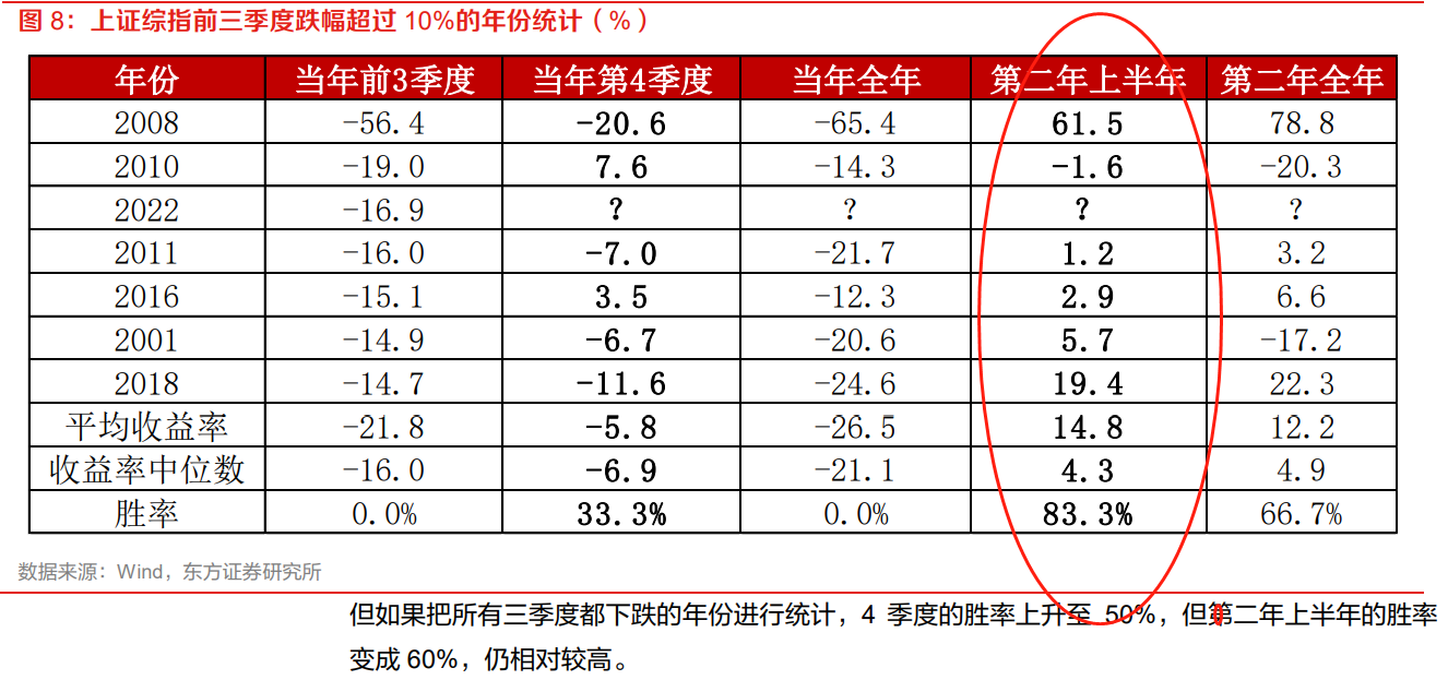 A股市场:自1990年以来,上证综指前三季度跌幅超过10%的年份共有7年,分别为2008年、2010年、2022年、2011年、2016年、2001年和2018年。第四季度互有涨跌,但第二年上半年的上涨概率为83%。