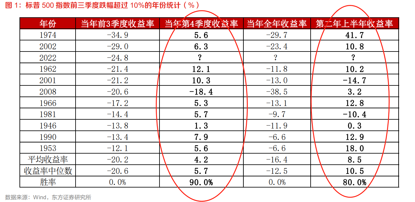 美股市场:标普500指数在当年前三季度跌幅大于10%的年份中,当年第四季度获得正收益率的胜率为90%,第二年上半年获得正收益率的胜率为80%。