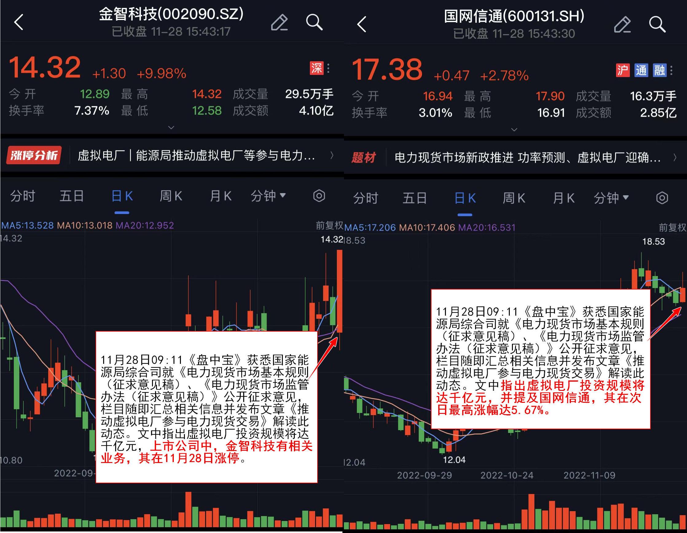 11月28日09:11《盘中宝》获悉国家能源局综合司就《电力现货市场基本规则(征求意见稿)、《电力现货市场监管办法(征求意见稿)》公开征求意见,栏目随即汇总相关信息并发布文章《推动虚拟电厂参与电力现货交易》解读此动态。文中指出虚拟电厂投资规模将达千亿元,并提及金智科技、国网信通等多家上市公司,其中金智科技在11月28日涨停,国网信通最高涨幅达5.67%。