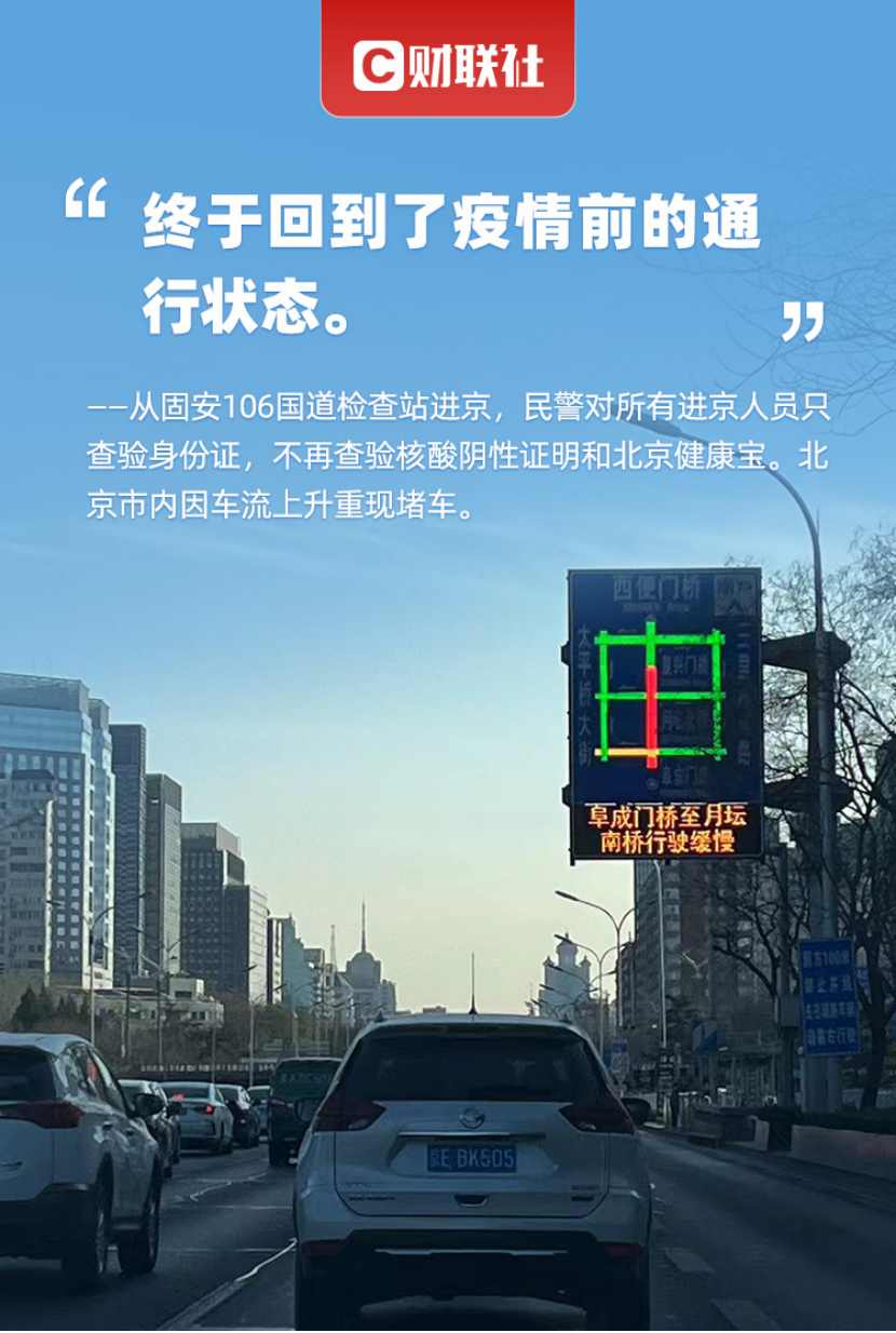 12月8日,进京道路检查站已不再查验核酸阴性证明,车辆通过速度明显加快。“终于回到了疫情前的通行状态。”一位车主对财联社记者笑道。而在市内,由于高峰期车流量比此前多出三成,部分路段又开始重现拥堵。