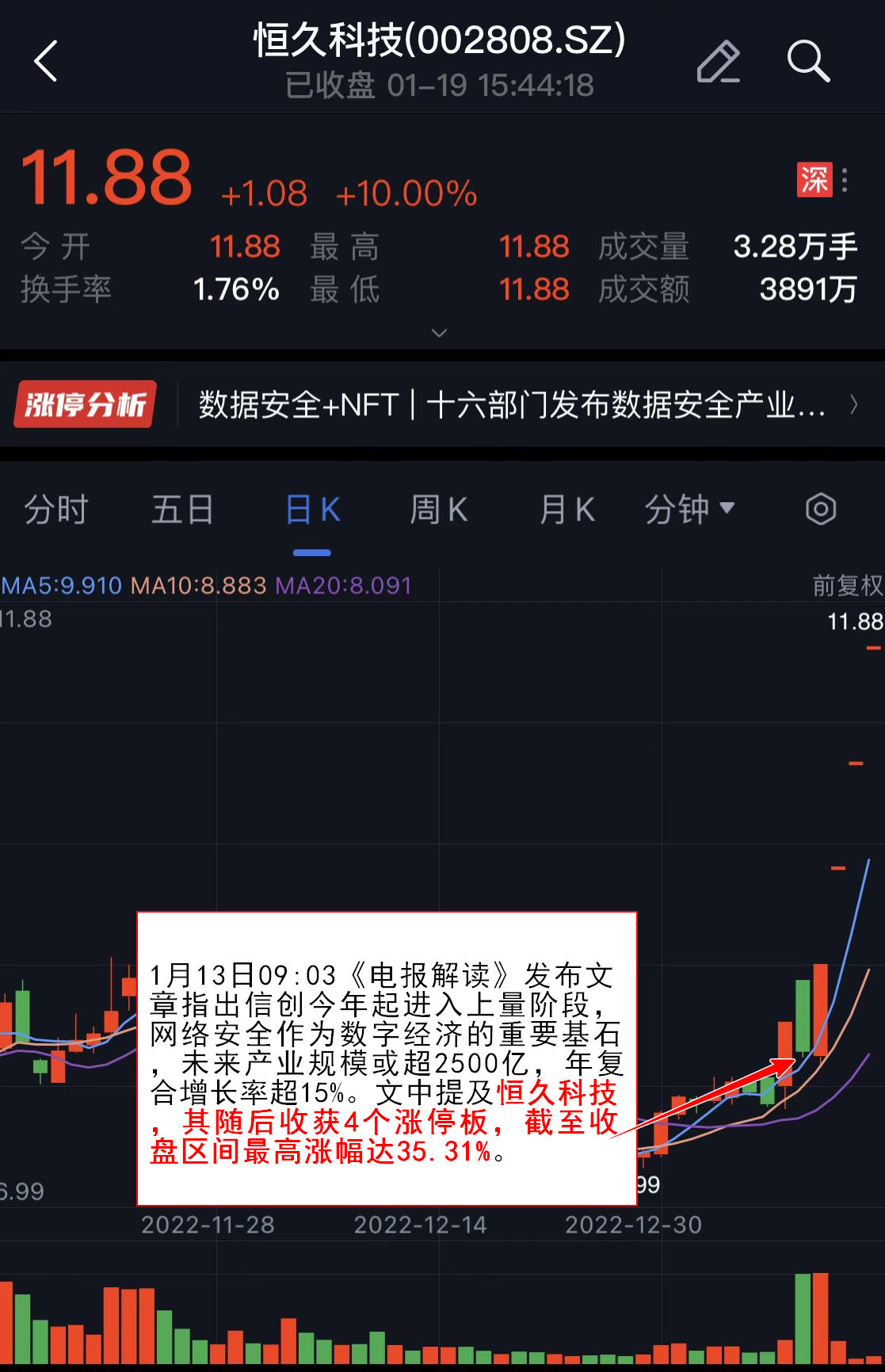 1月13日09:03《电报解读》发布文章指出信创今年起进入上量阶段,网络安全作为数字经济的重要基石,未来产业规模或超2500亿,年复合增长率超15%。文中提及恒久科技,其随后收获4个涨停板,截至收盘区间最高涨幅达35.31%。