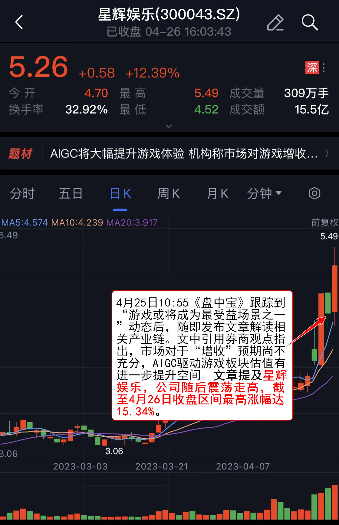 4月25日10:55《盘中宝》跟踪到“游戏或将成为最受益场景之一”动态后,随即发布文章解读相关产业链。文中引用券商观点指出,市场对于“增收”预期尚不充分,AIGC驱动游戏板块估值有进一步提升空间。文章提及星辉娱乐,公司随后震荡走高,截至4月26日收盘区间最高涨幅达15.34%。